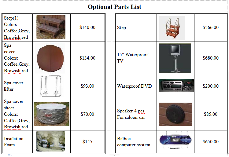 | 1.Spa Shell | 1pc | 15.Seat capacity | 2 persons | |||